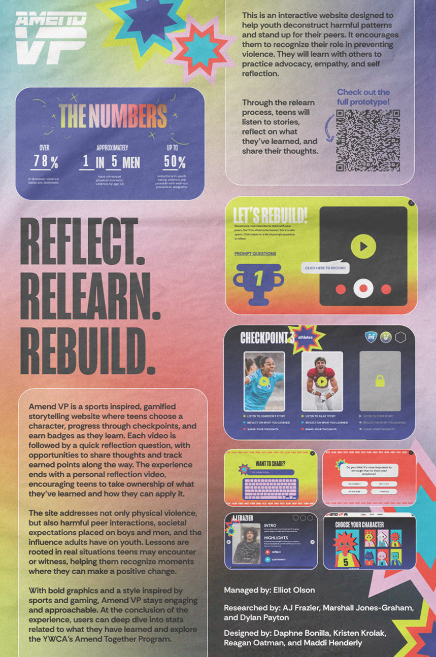 Amend VP is an interactive website concept designed to help youth deconstruct harmful patterns and stand up for their peers. It encourages them to recognize their role in preventing violence. They will learn with others to practice advocacy, empathy, and self reflection. It was completed and presented to Derek with the YWCA’s Amend Together Program.
